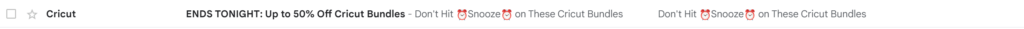 Cricut handles the issue of variable character limits and spacing by doubling up on its preview text and using an HTML email preview text spacing hack that I’ll describe next.